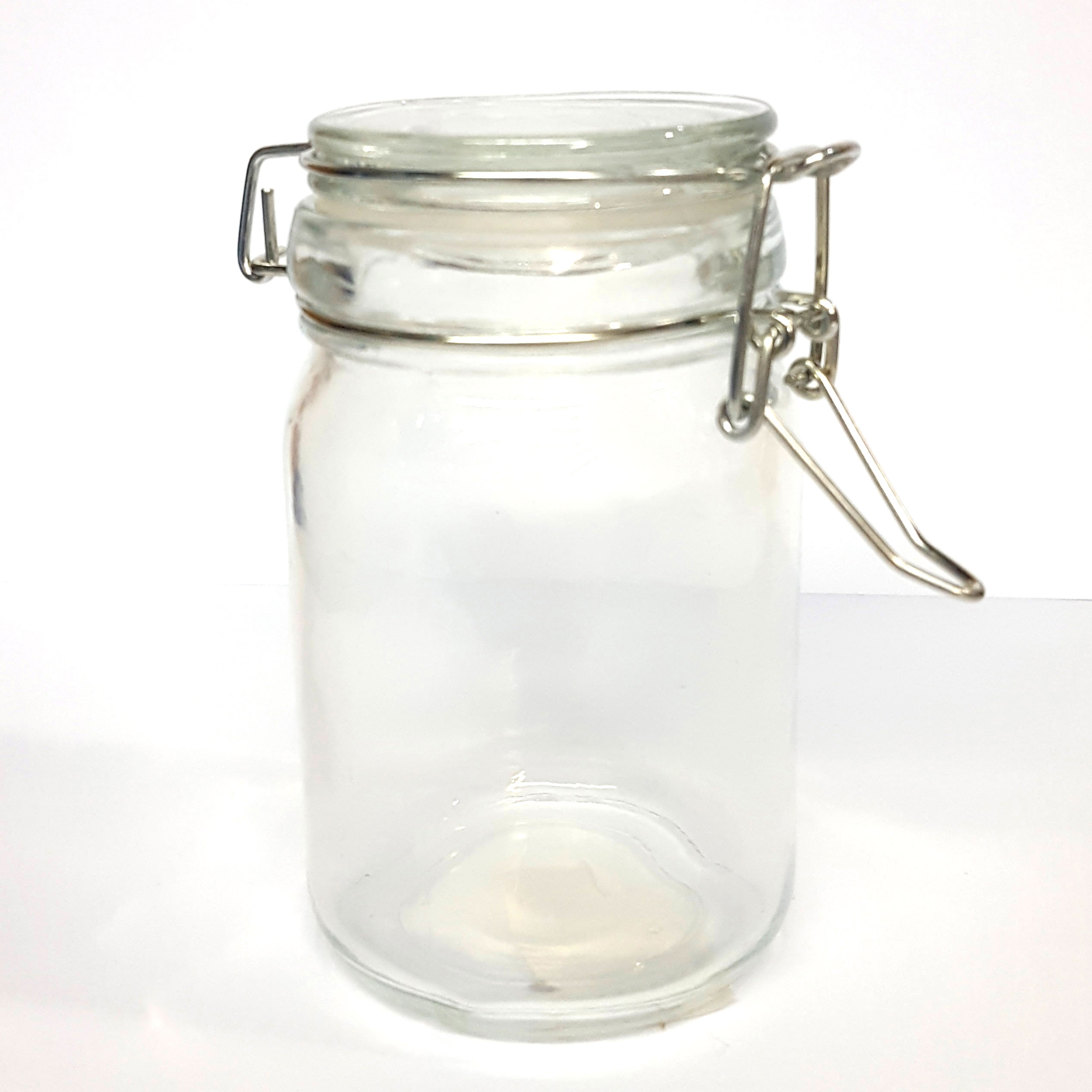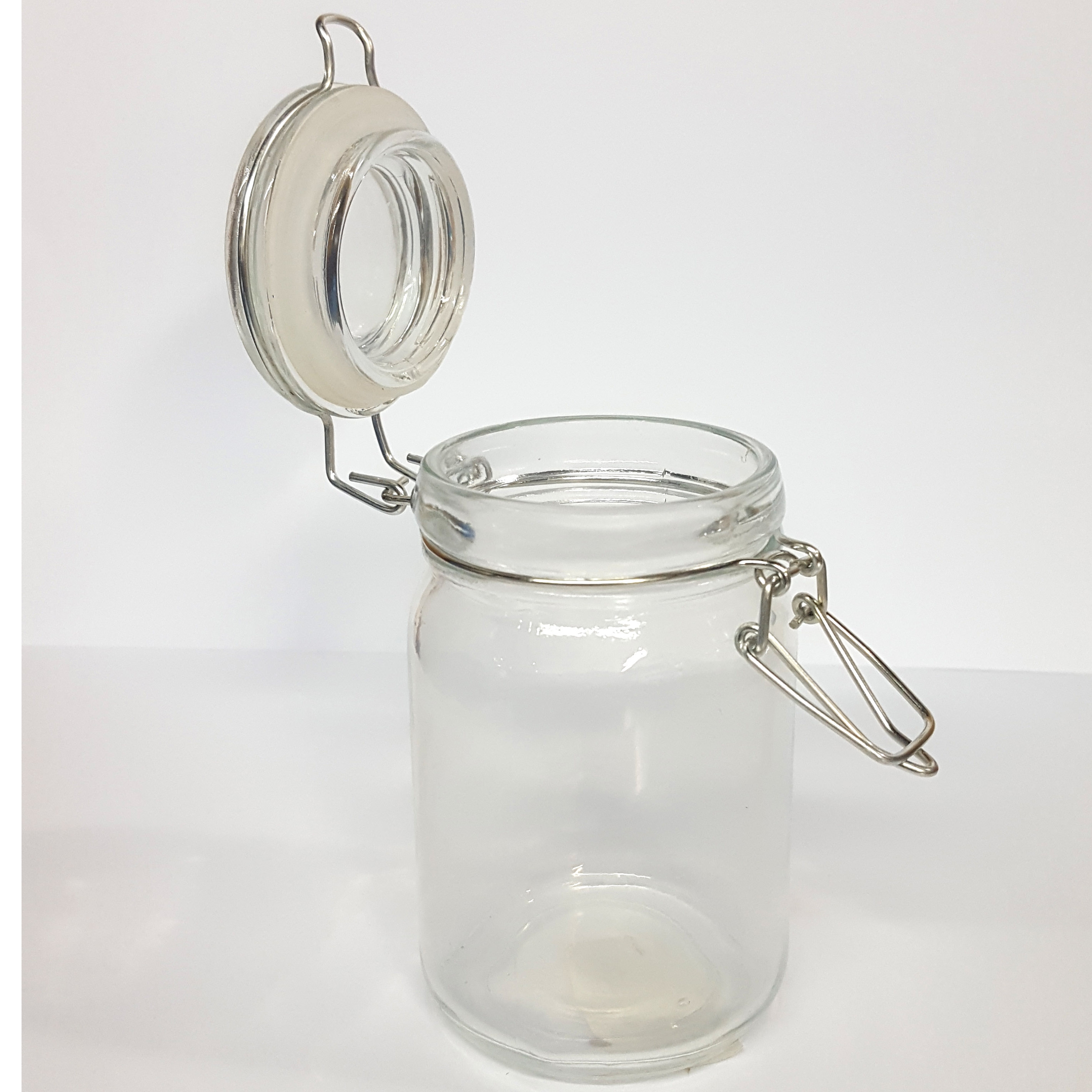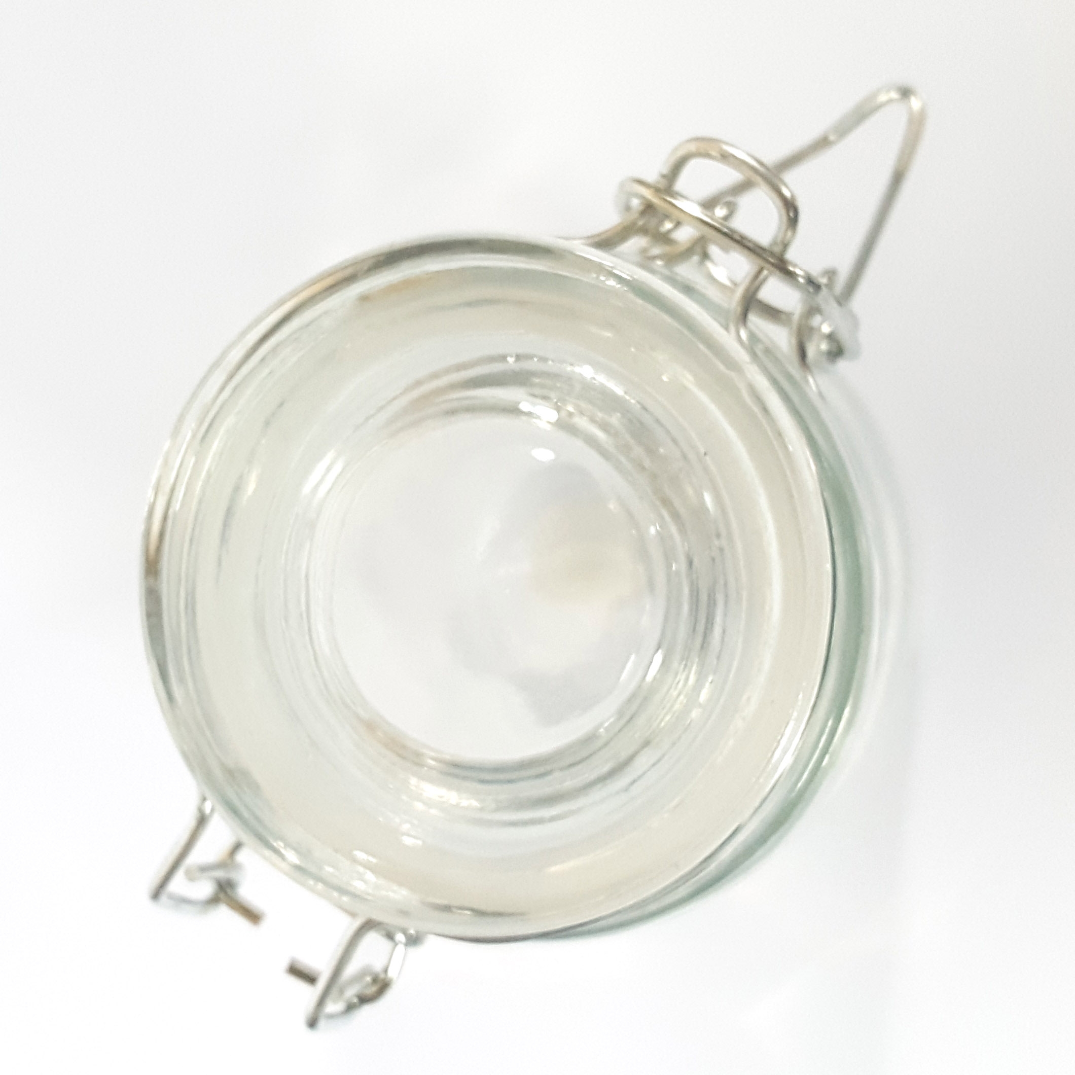 Bote de cristal circular con cierre por presión de 230 ml de capacidad.