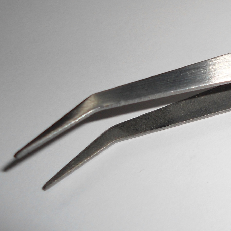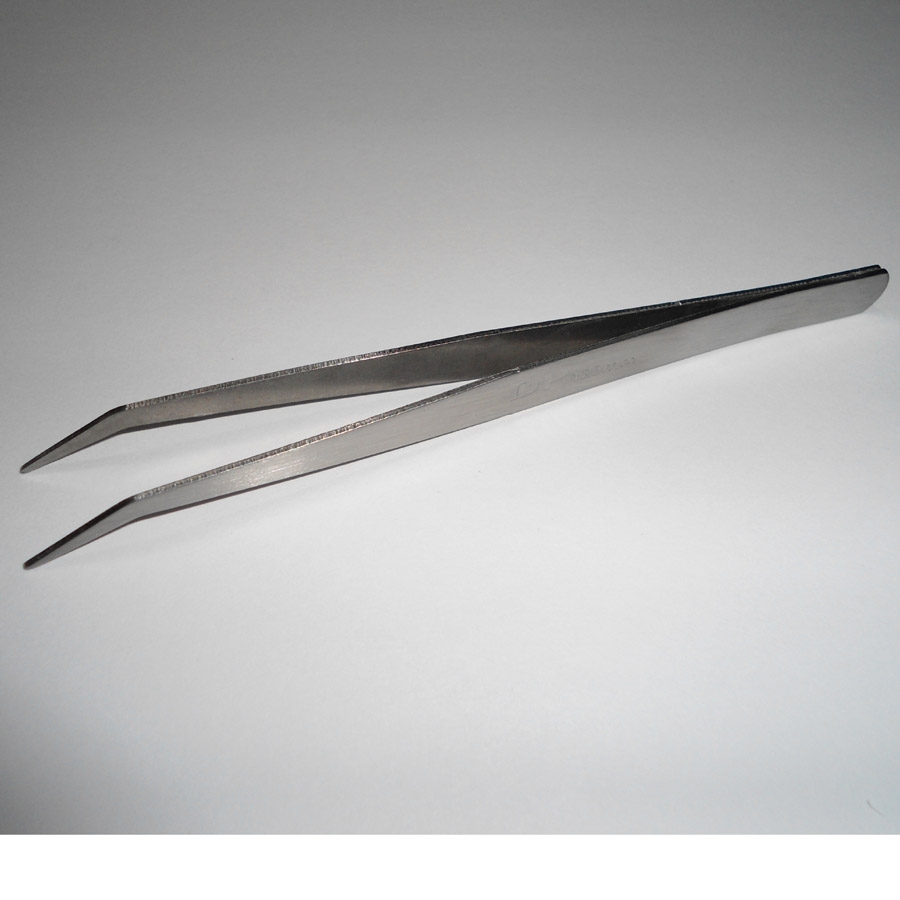 Pinzas de 12,5 cm de largo en plata mate con pico torcido, muy útiles para su uso en creaciones hama beads.