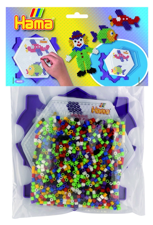 Pack múltiple compuesto de marco, 1000 piezas, placa pegboard hexagonal 15 cm y diseños hama beads midi.