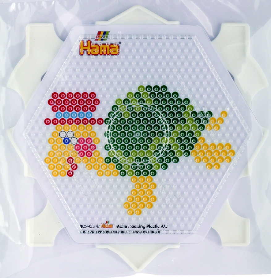 Pack múltiple compuesto de marco, placa pegboard hexagonal y diseños hama beads midi.
